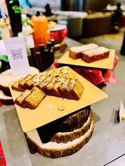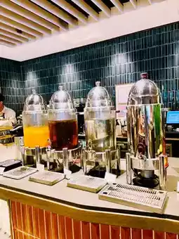 The café is located on the LG floor of the hotel, with an interior design themed "From Sunrise to Sunset," cleverly using orange and wood-tone brown decor. Floor-to-ceiling glass windows let sunlight pour into the restaurant, creating a vibrant holiday atmosphere.