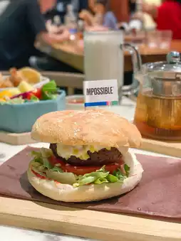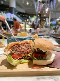 The bun and cheese are both vegetarian π§ The burger patty is pinkish when bitten, with "meat juice," very realistic!
