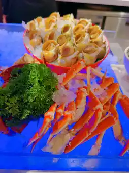 The restaurant offers everything from cold seafood platters, sushi, sashimi, to hot meat dishes and desserts, covering all bases ๐ The presentation is exquisite with a wide variety of options ๐ Truly delightful ๐ค