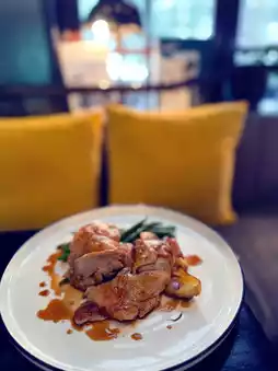 This main dish was a bit disappointing because after eating two high-quality pasta dishes, I had certain expectations for the main course, but it ended up being a letdown. The roasted chicken leg wasn’t crispy enough on the outside, and the meat wasn’t tender enough, failing to achieve the crispy outside and soft inside effect. Also, the potato skin was very hard; I suggest using crispy roasted potato wedges for better flavor.