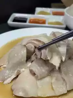 The must-try poached chicken has crispy skin and tender meat, with a layer of flavorful jelly in the middle. It comes with three homemade sauces: dark soy sauce, spicy chili sauce, and ginger paste, which are appetizing and flavorful, perfectly elevating the chicken's taste.