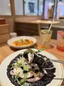 First, we ordered the squid ink octopus risotto 🐙. The octopus was chewy, the rice creamy and full of squid ink flavor, very authentic Korean taste.