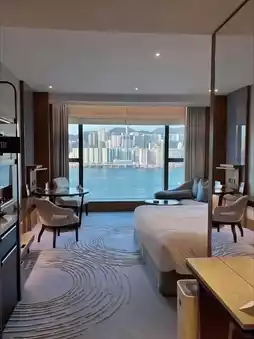 Step into the room and a vast sea view unfolds before your eyes—the shimmering waters of Victoria Harbour and the distant city skyline, so beautiful it feels unreal. During the day, sunlight sparkles on the sea; at night, the lights shine brilliantly and dazzlingly.