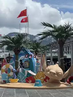 The Ocean Terminal outdoor plaza is transformed into a Hawaiian beach, featuring a 3-meter-tall Stitch surfing statue and a 2-meter sand sculpture head that attract countless eyes. A free sandcastle building area offers fun for families. The 7-meter-tall "Wisher Stitch" stands proudly at the Ocean Terminal viewpoint, with Victoria Harbour as the backdrop, creating a stunning photo spot.