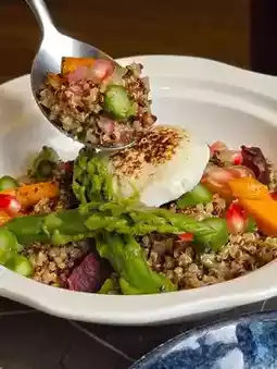 The appetizer salad contains quinoa, pomegranate seeds, onions, asparagus, pumpkin, and goat cheese, providing a rich texture and a slightly sour taste that is very appetizing.