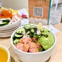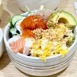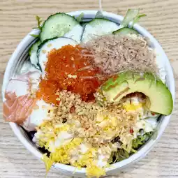 I chose brown rice and salad greens as the base. It arrived as a big bowl with very vibrant colors! The taste was a pleasant surprise, unexpectedly delicious! The salmon was rich and fatty, with crunchy crab roe. The bonito flakes, shredded egg, and avocado all paired well, and the portions of salad greens and brown rice were generous. The dressing matched perfectly, making the whole bowl very tasty!
