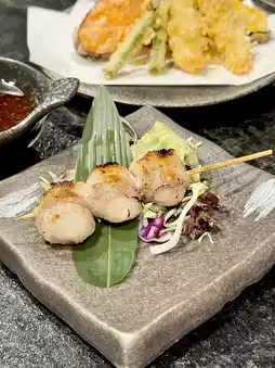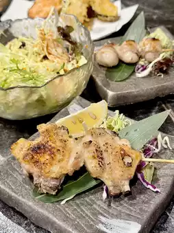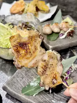 Kagoshima Black Pork Lychee Roll Skewers are juicy and rich. The salt-grilled chicken wings have thin, fragrant skin.