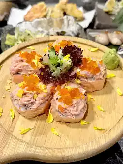 The rolls are the signature must-order. The Red Beauty is big, with spicy tuna paste, spicy salmon, crab sticks, and avocado. The thick layer of tuna paste is topped with crab roe and salmon roe, the natural salty freshness is the best seasoning.