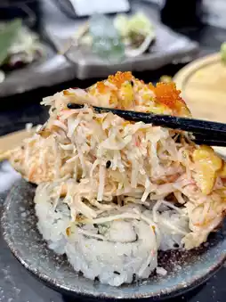 The Volcano Roll was ordered by my boyfriend, with scallops, cucumber, avocado, and crab sticks. The crab shreds are really abundant. Although the ingredients seem ordinary, the taste is exceptionally good, and the flame-grilled effect is truly Instagram-worthy! It has a bit of an icy-hot dual sensation.
