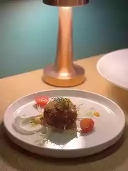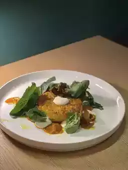 Pan-Seared Baby Octopus Risotto Cake with Spicy Tomato Sauce and Parmesan Cheese Foam: The risotto cake is crispy on the outside, soft and moist inside, and the baby octopus is chewy☺️ Paired with tangy and spicy tomato sauce, light Parmesan cheese foam, and fresh tender spinach, the flavors are rich and layered😋
