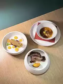 The plating is very exquisite🤩 Three different duck preparations: tender applewood-smoked slow-cooked duck breast, crispy on the outside and soft inside duck leg confit with foie gras spring roll, and a sweet and savory French foie gras caramel custard💛