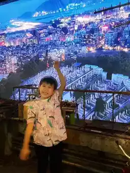 The "Walled City Light and Shadow Rooftop" features a large projection screen displaying day and night views of Kowloon Walled City, accompanied by the sound of low-flying airplanes, making us feel as if we are on the rooftop scene from the movie.