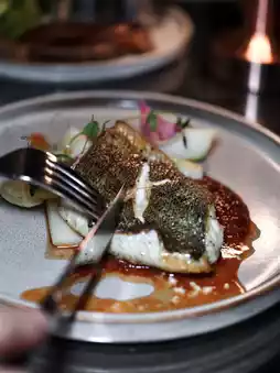 The fish maintains a tender texture with a slightly crispy skin😍 Served with white asparagus and boiled potatoes, uniquely paired with chili crab sauce for a spicy and appetizing taste