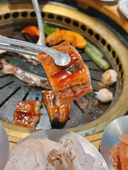 The self-service area offers appetizers, salads🥗, drinks🥤, and desserts🍧 for you to help yourself. It is clean and well-organized. There are many kinds of Korean appetizers, homemade kimchi, and spicy marinated rice crabs worth trying. There are also various fresh vegetables and lettuce to accompany the grilled meat🥬. Don’t miss the sweet and juicy grilled pineapple🍍. Drinks include soda, yuzu honey, and hot tea🍵. Desserts include vanilla ice cream🍨, brownies, and cream puffs🍰, making for a very satisfying meal.
