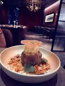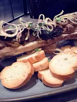 Recommended dishes include bone marrow toast, roasted pork saddle with apple sauce, lobster mac and cheese, and caramel pudding.