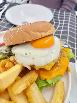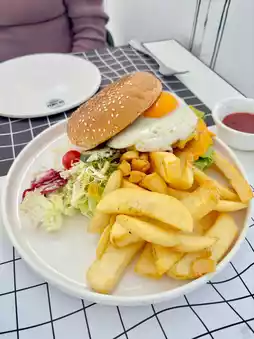 We ordered two lunch dishes: a sunny-side-up egg with double cheese beef burger and sole fillet with mentaiko cream sauce. The burger features thick double cheese and juicy beef, with the runny yolk of the sunny-side-up egg adding a rich flavor to the whole burger. The sole fillet is tender and delicious, paired with the mentaiko cream sauce for a rich layering of flavors.