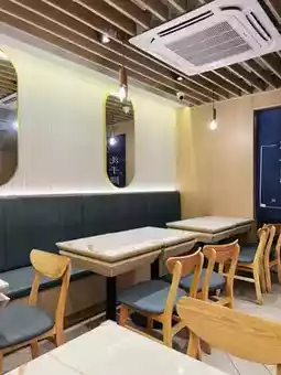 The interior is spacious and comfortable, decorated mainly in pure white. Drawers contain utensils, menus, and napkins, and there is a self-service area with drinking water.
