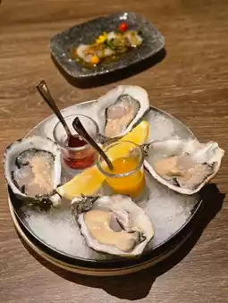 Japanese scallops with lemongrass vinaigrette and French oysters. The oysters are plump, uniquely paired with passion fruit sauce, refreshing and delightful.