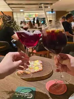 A mix of rum, Italian black cherry liqueur, lime juice, cranberry juice, and red wine, with a prominent tartness and a rich red color. Served in a bird-shaped glass, it’s especially charming.