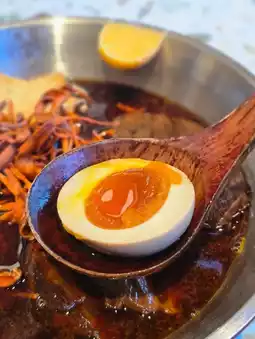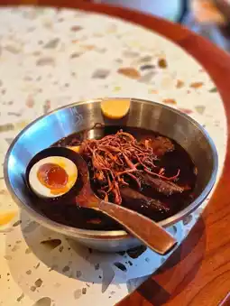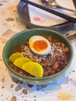 The braising sauce is rich, and the combination of meat and rice has an excellent texture, served with half a soft-boiled marinated egg.