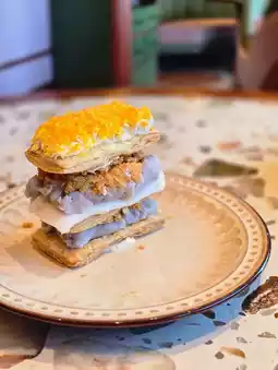 This signature dessert is made fresh to order. The three-layer Napoleon is filled with different fillings, offering a rich and multi-layered taste. The crispy pastry base pairs with chilled taro paste and chewy mochi, topped with salted egg yolk crumbs for garnish.