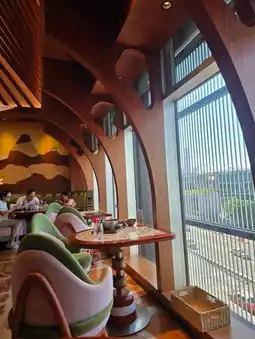 Last week, I went to Taipei Zhan for lunch with friends at the World Trade Center. The restaurant is inspired by Taiwan Railways and features private rooms designed like royal flower carriages. The entire restaurant's decor is meticulously designed, with a gradient sunset view of Alishan on the walls and indigenous colorful elements decorating the corners, creating an atmosphere full of Taiwanese charm.