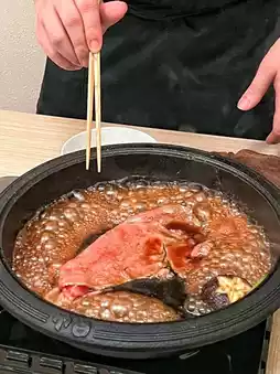 For the main sukiyaki dish, the chef cooks it right in front of us. Whether it’s the ribeye in the "Matsu" or the sirloin in the "Take," the meat is very tender, with the fat and meat flavors perfectly blended. The sukiyaki comes with five kinds of vegetables, including Japanese green onions, tofu, vermicelli, shiitake mushrooms, snow peas, and onions. The chef serves the vegetables together with the Wagyu, and dipping it in egg yolk makes it incredibly delicious.