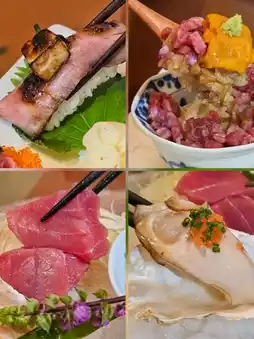 The "Matsu" sashimi trio features the crisp and sweet Hyogo Prefecture golden warrior oysters, smooth and fresh Hokkaido sea urchin, and tuna. The "Take" set offers three pieces of Wagyu sushi from different cuts. The foie gras A5 Wagyu sushi uses low-temperature roasted beef shoulder, rich in flavor, combined with seared foie gras, blending the fats of beef and foie gras for a full, rich taste. The sea urchin A5 Wagyu scattered sushi uses finely chopped Wagyu sirloin paired with creamy sea urchin, creating a complex texture. The caviar Wagyu roll uses ribeye, with the fresh flavor of the caviar further enhancing the sushi’s taste layers.