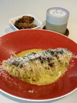 Made with wide flat fettuccine, every bite is filled with thick creamy cheese sauce, delicious and flavorful. The bacon is pan-fried to a slight crisp with a salty aroma, and the portion is generous!