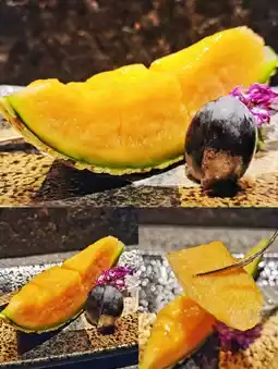 Today's dessert was netted melon π with Kyoho grapes π. The melon was super sweet and juicy π¦, the grapes were large and refreshingly sweet, perfectly ending this ultimate feast π.