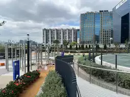 Next to the play facilities, there are plenty of resting areas where parents can relax in pavilions while watching their children, enjoying the sea view and the distant skyscrapers, truly refreshing for the mind and soul. There are also green spaces and flower beds filled with colorful flowers, giving a very natural feeling.
