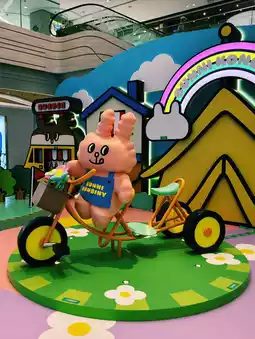 Tseung Kwan O Plaza, located at 9 Tong Tak Street, Tseung Kwan O, Kowloon, next to the MTR Tseung Kwan O Station, is a popular shopping landmark in the area. This spring, the super popular "Bunni Konbiny Rabbit Convenience Store" transforms into a picnic playground (open until June 19), injecting cuteness into this urban oasis! Created by Hong Kong illustrator Stella Lin, the three rabbits—Mayo, Mogu, and Mame—along with their friend Jomi, bring six major photo spots: a 4-meter tall inflatable Mayo leisurely lying on a picnic mat, Mogu’s tricycle inviting you to enjoy spring together, Jomi’s golf putting station challenging your sports spirit, plus a carousel bike and a squirrel swing, all full of childlike fun.