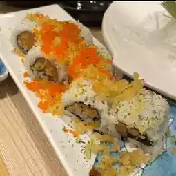 The sushi is topped with crab roe and crispy tempura, creating a unique texture when eaten together.