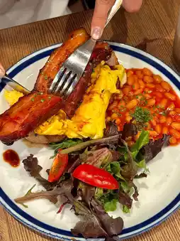 Thick sliced bacon is full of charred aroma, red and red looks super tempting, yellow robe scrambled eggs are super smooth and tender, with sour toast and fresh tomato sauce baked beans, super rich taste, very satisfied after eating