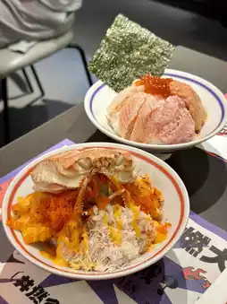 This bowl includes crab claws, crab meat, crab roe, crab eggs, and crab sticks—truly packed with crab! Each ingredient is served in generous portions. When served, the bowl is covered with a whole crab shell, making for a unique presentation. You can choose your sauce; I went with sea urchin sauce, which made the overall flavor very fresh and rich.