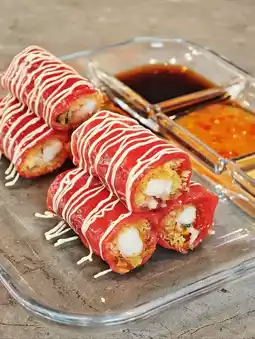 Crispy Prosperity Red Rice Rice Noodle Roll 👍 looks bright red and super lucky, with a soft outside and crispy inside double texture. Filled with shrimp bursting out and crispy fried netting ✨, fresh and tasty with rich layers!