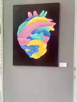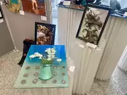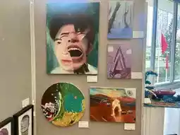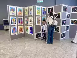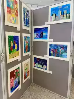 The hall houses a large and innovative collection of artworks, including paintings, sculptures, crafts, and AI creations, showcasing the creative achievements of local students and artists.