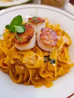The food, drinks, and desserts are all quite good. I ordered lobster sauce wide egg noodles with pan-seared scallops; the handmade pasta has a chewy texture, like it~ Pistachio duo: pistachio latte + pistachio Basque cheesecake, with a pistachio aroma that’s not too sweet.