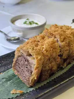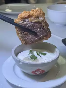 The Angus beef, with its beautifully marbled appearance, is of top quality. The crispy exterior encases perfectly cooked wagyu beef, which is tender and full of beefy flavor. Paired with a tangy yogurt sauce, it balances the richness of the beef beautifully.