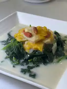 Golden ear mushrooms, a type of edible fungus, have a rich, savory flavor reminiscent of salted egg yolk. The creamy fish soup pairs wonderfully with tender French spinach sprouts, creating a dish that is both rich and refreshing.