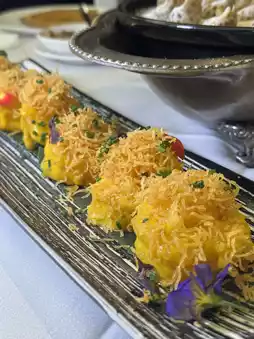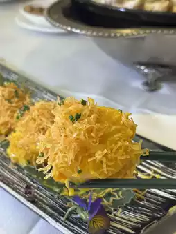 A refreshing summer dish featuring giant prawns coated in a sweet and tangy mango sauce. Topped with crispy golden threads, the prawns are incredibly bouncy and flavorful.