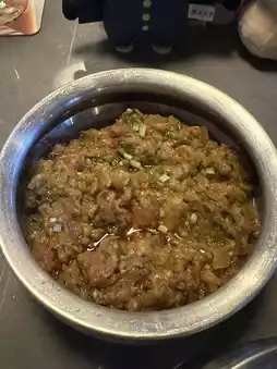 This is smoked roasted eggplant, a very characteristic Indian curry with Indian spices that lets you taste the natural sweetness of the vegetables. It pairs perfectly with Indian naan bread.