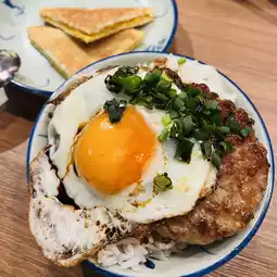 The sunny-side-up egg and meat patty are pan-fried crispy on the outside and soft inside 😋