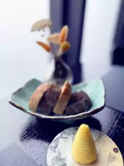 The marbling of Japanese Miyazaki A4 Wagyu is beautiful and melts in your mouth. The sirloin is the rear loin near the hip, with elastic meat texture and a chewy bite, each mouthful rich with beef flavor. There is also fried oxtail and Japanese radish, adding a slight sweetness. Additionally, the yellow lemon sauce around the edge balances the richness of the Wagyu.