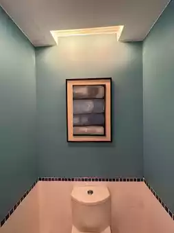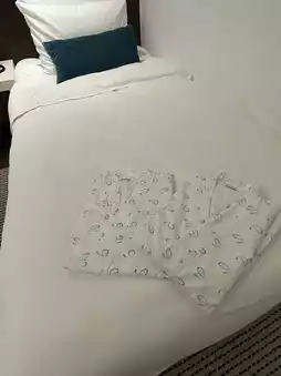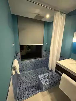 The ocean view rooms feature a spacious bathtub and a calming design with a light blue color scheme! When you open the curtains, you can enjoy the ocean view from the room!