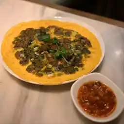 A thin crispy egg pancake wrapped around juicy oysters, bursting with scallion aroma and rich texture, making you want to take bite after bite 😍