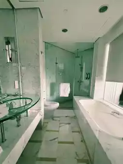 The rooftop on the 41st floor has a swimming pool with few people, and the chlorine disinfectant smell is quite strong. Officially, it closes at 7 PM, but when there are few guests, the rule is not strictly enforced.