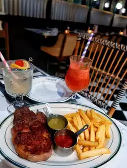 🥩 Argentine Angus Ribeye Steak: Charcoal-grilled with a crispy sear wrapping a tender pink center, rich meaty flavor with nutty notes, served with crispy fries.