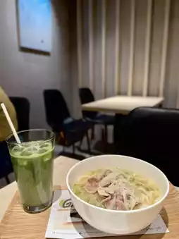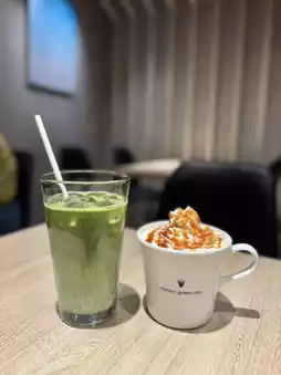 For drinks, the iced matcha milk has a strong matcha flavor and a smooth milky taste; the hot roasted tea milk with caramel cream adds sweetness to the drink.