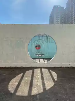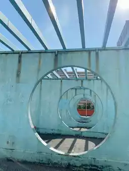 Rows of light blue circular open walls. Under the sunlight, the shadows they cast create their unique feature.